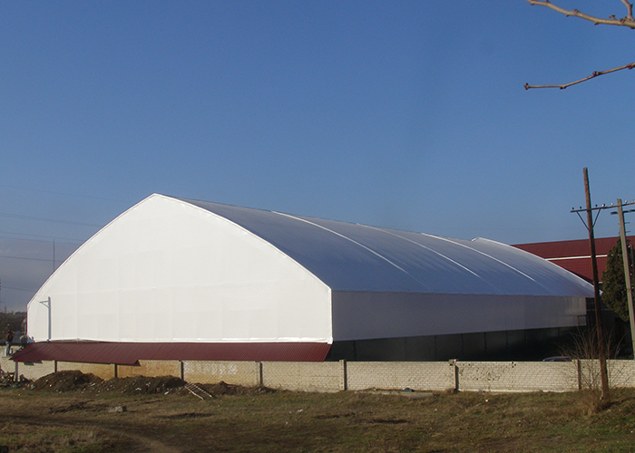 Ангар з подвійним тентовим покриттям, площею 1200м2 і більше, здатний ефективно виконувати завдання зі зберігання та обслуговування літаків малої авіації та інших літальних апаратів. Споруда також дозволяє розмістити кілька спортивних майданчиків, боксерський ринг, трибуни для глядачів і відсіки для переодягання. У процесі експлуатації приміщення може бути використано для організації ярмарків, концертів або пристрою атракціонів. Колір тентового покриття даху забезпечить необхідну освітленість простору не вдаючись до використання основного електричного звіщення в світлий час доби. Відповідно до проектної документації та з урахуванням особливостей конструкції, такий варіант виробу може бути виготовлений і змонтований на об 'єкті замовника протягом 60-и робочих днів. За бажанням замовника в проектну документацію можуть бути внесені окремі зміни, що не суперечать існуючим технічним нормам і правилам для даного типу споруд.