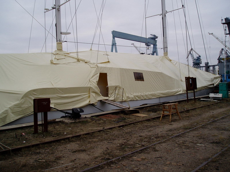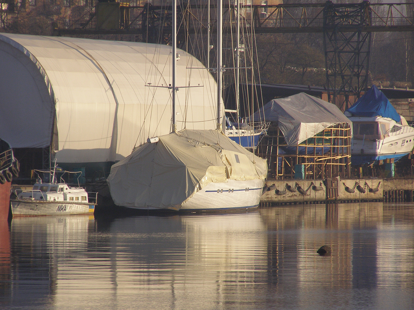Збірно-розбірний або стаціонарний навіс для яхти, катери, човни, обладнаний міцним і надійним тентовим покриттям - сучасний і надійний спосіб їх зберігання в зимовий період і захисту від атмосферних опадів. Конструкція передбачає доступ в укрите приміщення з можливістю виконання робіт з обслуговування та ремонту. Застосування в покритті світлопропускаючої ПВХ-тканини забезпечує достатню освітленість внутрішнього простору.