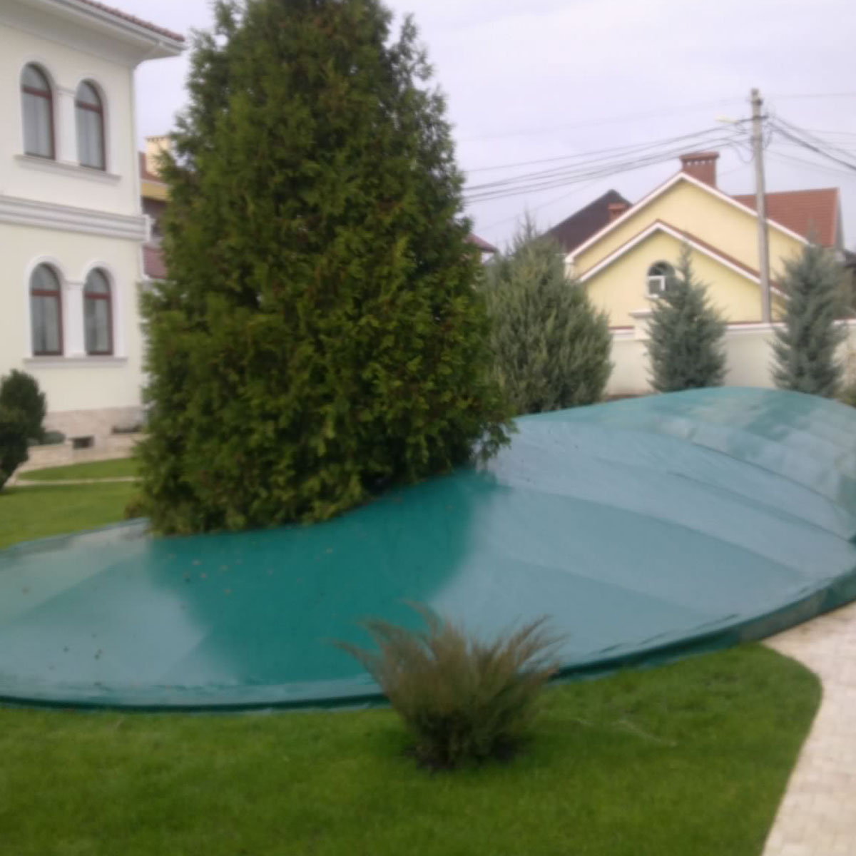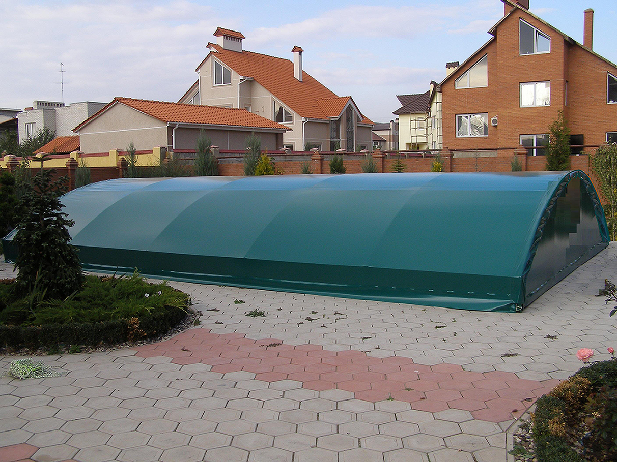 Найнадійніший варіант захисту басейну від накопичення сніжної маси, сухого листя і пилу - каркасний тент. Відносна громіздкість конструкції може скласти проблему при її зберіганні у літній період. Перетворити цей недолік на перевагу допоможе Ваша передбачливість при плануванні розміщення літніх навісів на ділянці. Каркас і тентове покриття басейну може зайняти своє місце в сховищі, а може стати і навісом для захисту від дощу і яскравого літнього сонця...